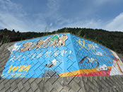 エントランスにてさっそく大漁旗を発見!そしてグラウンドに入るとカラフルなガーデンセットがずらり!未来スケッチちょきんばこから贈らせて頂いた品々と久々の再会となりました。今回が初披露ということでどれも真新しい姿をしていましたが、これから女川のみなさんの手によって使い込まれ、町に溶け込んでいくのもまた楽しみですね。