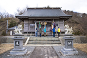 さっそく女川の海に掲げなければ!ということで、新年会の翌日に再集合。急なことで竹は準備できず、取り急ぎ用意できた物干し竿に新品の大漁旗を結び付けていきます。まずは大漁旗を担いで熊野神社を参拝。大漁旗完成のご報告と共に、今年の我歴stockの晴天と成功をお祈りしてきました。