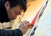 神楽幕は大型なので、上下二枚に分けて染色。最後にふたつを縫い合わせて一枚の絵を完成させます。「他で断られた仕事が最終的にうちに来るんです(笑)」とおっしゃる通り、仕事の大きさ、難しさにとらわれず、お客様の想いに応えることを大切にされている京屋染物店のみなさん。さぞ熟練した職人集団なのかと思いきや、その平均年齢はなんと35歳!伝統を受け継ぎながら新しいことに挑戦する姿は、大室南部神楽保存会のみなさんにも通じるところがあります。